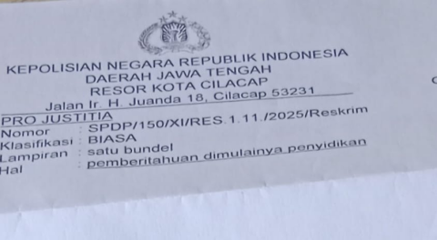 Laporan Polisi Nomor LP/B/94/XI/2025/SPKT/Polresta Cilacap/Polda Jawa Tengah tanggal 23 Nopember 2025 telah dilakukan penyelidikan hingga berlanjut ke penyidikan dengan rujukan terbit memulai Surat Perintah Penyidikan dengan nomor. SP. Sidik/150/XI/RES 1.11/2025/Reskrim, tanggal 27 Nopember 2025.