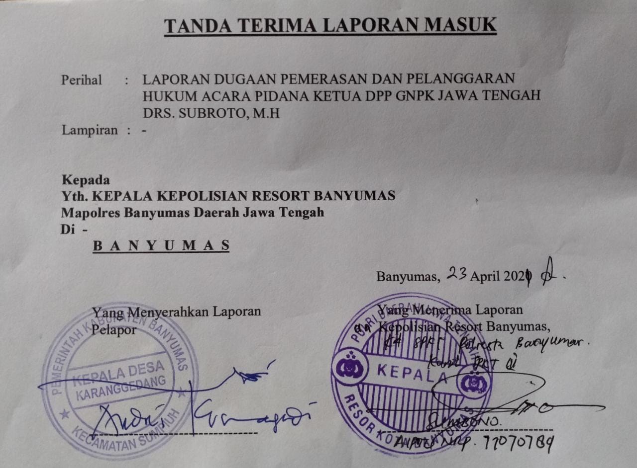 Seperti kesaksian dari beberapa desa, bahwa telah dikirimi surat oleh (BRT) oknum yang mengatasnamakan sebagai ketua lembaga GNPK Jawa Tengah yang pada akhirnya menakut-nakuti dengan dalih ada permasalahan di desa-desa kemudian memeras dana mulai dari 65 juta sampai dengan 100 juta agar tidak diperkarakan secara hukum oleh (BRT).
