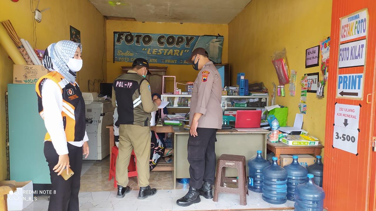 Nampak petugas gabungan memantau aktifitas warga di kawasan tugu Jiken. Jika ditemukan warga yang melanggar protokol kesehatan langsung di data dan diberikan tindakan tegas sesuai peraturan yang berlaku.