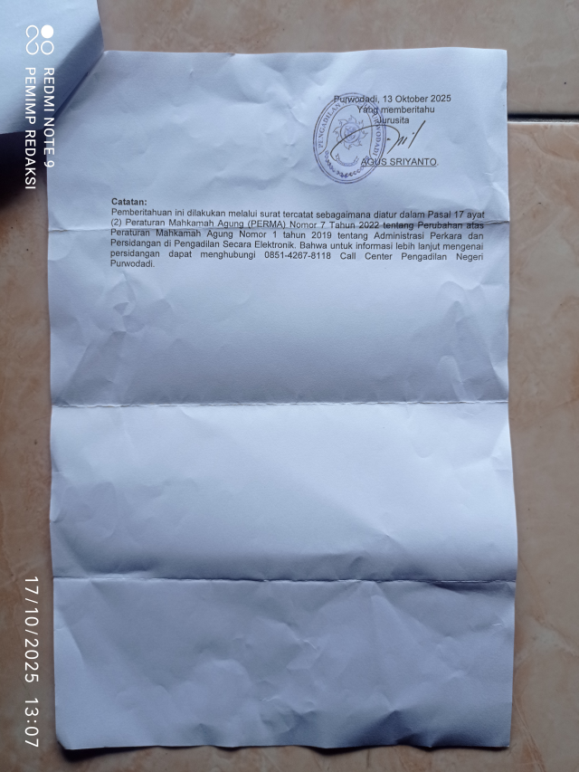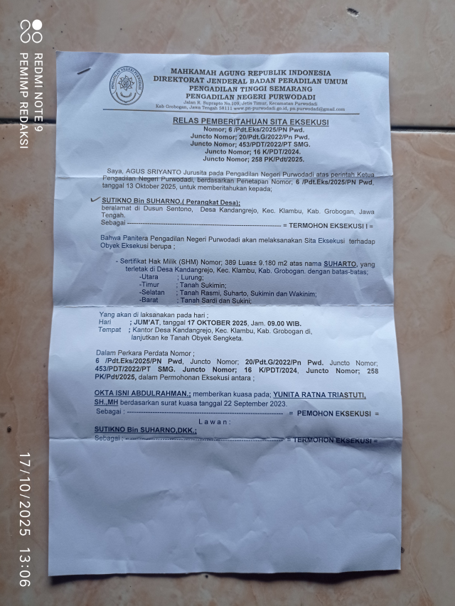 Pelaksanaan Sita Eksekusi tersebut berdasarkan Surat Pengadilan Negeri Purwodadi Grobogan Nomor 6/Pdt.Eks/2025/PN.Pwd; Jo.No.20/Pdt.G/2022/PN ped; Jo.No.453/PTD/2022/PT.SMG; Jo.No.16 K/PDT/2024; Jo.No.258 PK/Pdt/2025; tanggal 13 Oktober 2025, Tantang RELAS PEMBERITAHUAN SITA EKSEKUSI.